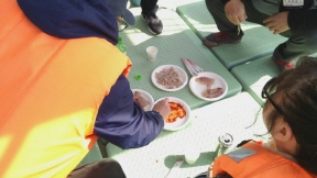 와타즈미 신사에서 고로케와 카스타드, 커피등을 나눠주시면서