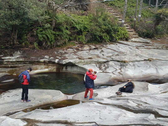 저마다 계곡을 배경으로 멋진 포즈를 취하며 사진을 찍습니다.