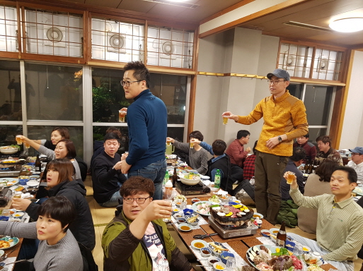 저녁은 해산물바베큐에 일본 사케.. 연이은 건배사에 분위기가 고조됩니다.