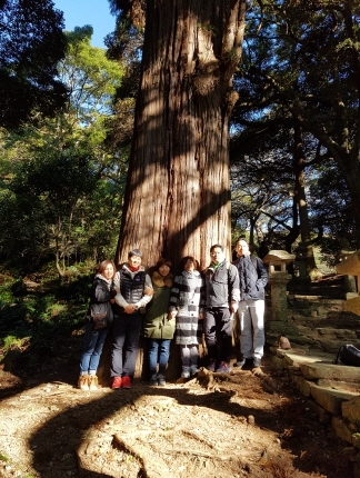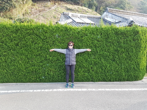 만송원에는 수령 1200년의 오래된 삼나무가 있어 손으로 둘레를 재어보며 기념사진을 찍습니다.