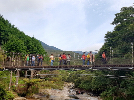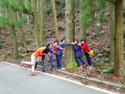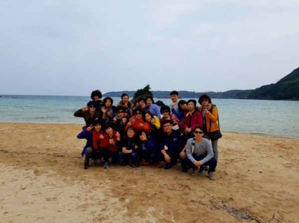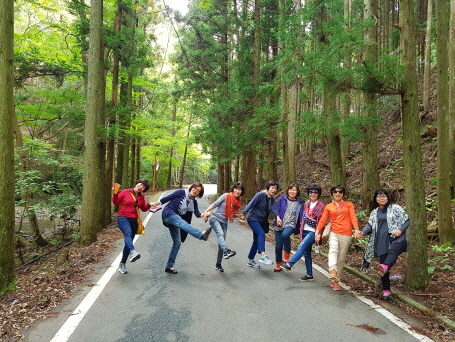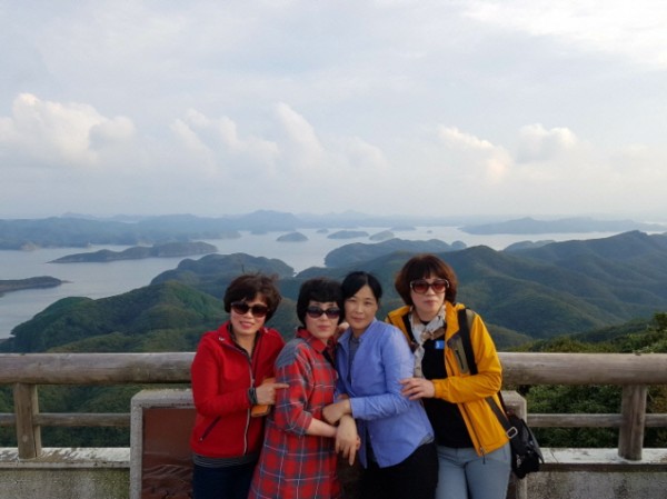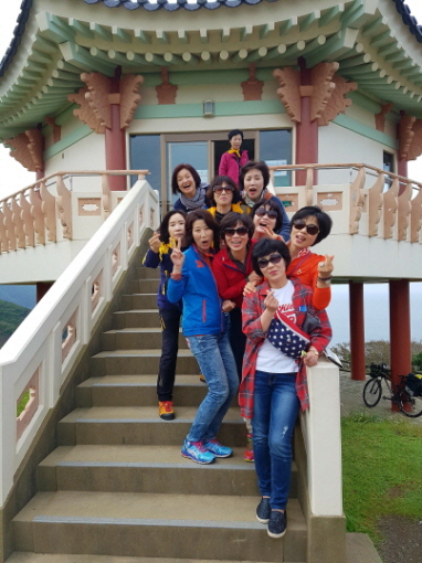 미우다 해변의 에메랄드빛 바다를 배경으로 단체사진을 찍고 한국전망대를 거쳐 단풍의 명소인 슈시로 달려갑니다.