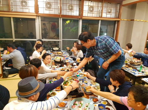 호텔에 여장을 푼 뒤 만송각 ‘론’에 모여 향토요리 이시야끼로 저녁만찬입니다.