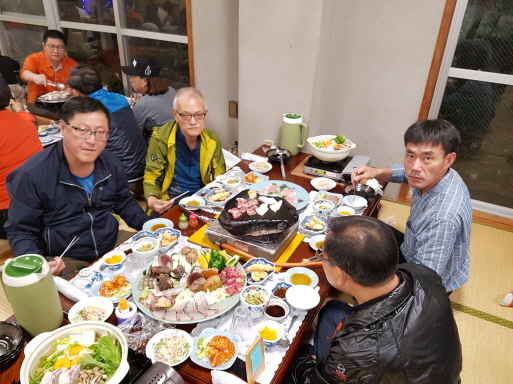 저녁으로 준비된 대마도 향토요리 '이시야키'의 푸짐한 차림에 만족하며, 향토술'시라다케'로 건배를 하며 첫날을 마무리합니다.