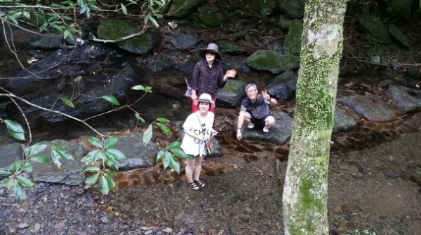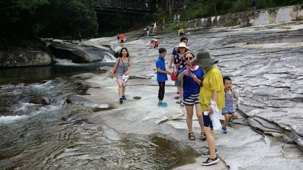 산책로 옆을 흐르는 시냇물에 손을 씻으며 더위를 식힙니다.