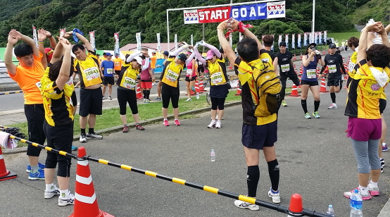 달리기전 준비 운동은 필수, 팀별로 모여 스트레칭을 합니다.