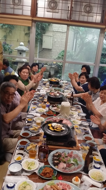 생선회와 푸짐하게 차려진 해산물 바비큐에 만족하시며 회장님의 건배사에 잔을 맞대며 흥겨운 분위기가 이어집니다.