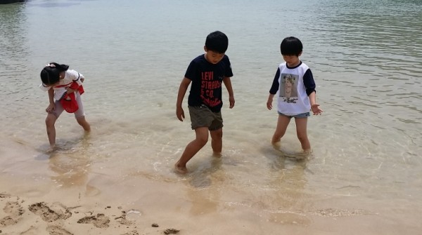 미우다해변에서 아이들은 맨발로 바다에 들어가서 물장구를 치며 즐거워 합니다.