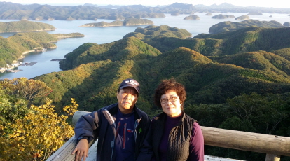 하대마에서 바라보는 아소만과 왼쪽으로 보이는 대마도의 영산 시라다케, 그리고 전망대 뒤쪽의 숲길이 멋집니다