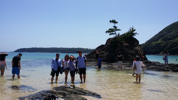 아름다운 해변 100선을 자랑하는 미우다해수욕장에는, 주말을 이용해 해수욕을온 일본인 가족도 드문드문 보이고, 우리 선생님들은 고운 모래사장에 신발을벗고 바다속으로 들어가시거나, 돌섬을 배경으로한 사진을 카메라에 담으시기에 바쁘십니다