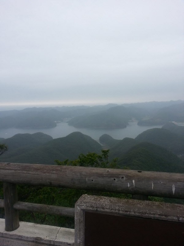 구름이 잔뜩 낀 에보시다케 전망대에서 바라다보는 아소만의 모습은