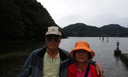 물에 잠긴 토리이 앞에서 다정히 사진 찍으시는 모습들이