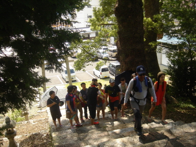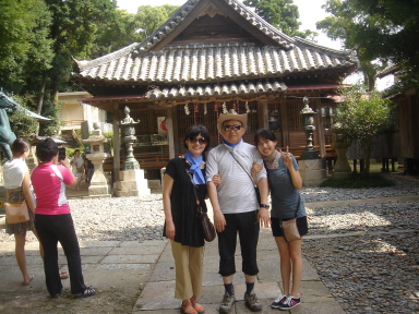 녹나무가 우거진 팔번궁신사 그늘밑에서 신사의 이모 저모 살펴보고,