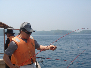 낚시가 첨 이신 어머니는 눈먼 고기들이 계속 걸려들고,